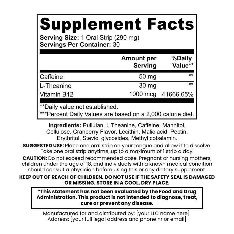The combination of caffeine and L-theanine acts synergistically to provide sustained energy levels for several hours. In addition, Vitamin B12 has been added, as it helps you stay physically and mentally energized through its essential role in converting carbohydrates into glucose, the fuel your body needs for energy. In addition, our strips are carefully embedded with nutrients that can be absorbed directly into your mouth, skipping the digestion time in your stomach. This natural combination of caffeine and anxiety-reducing amino acids immediately increases alertness.