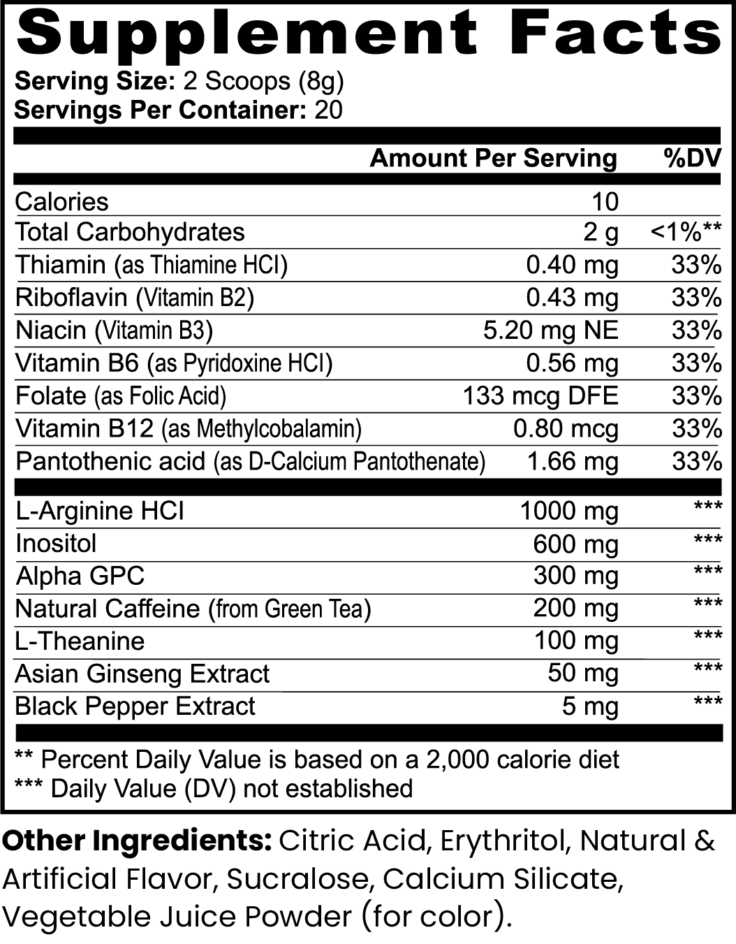Helps maintain focus and concentration with a blend of cognitive-supporting ingredients like Alpha-GPC, L-Theanine, and Natural Caffeine.