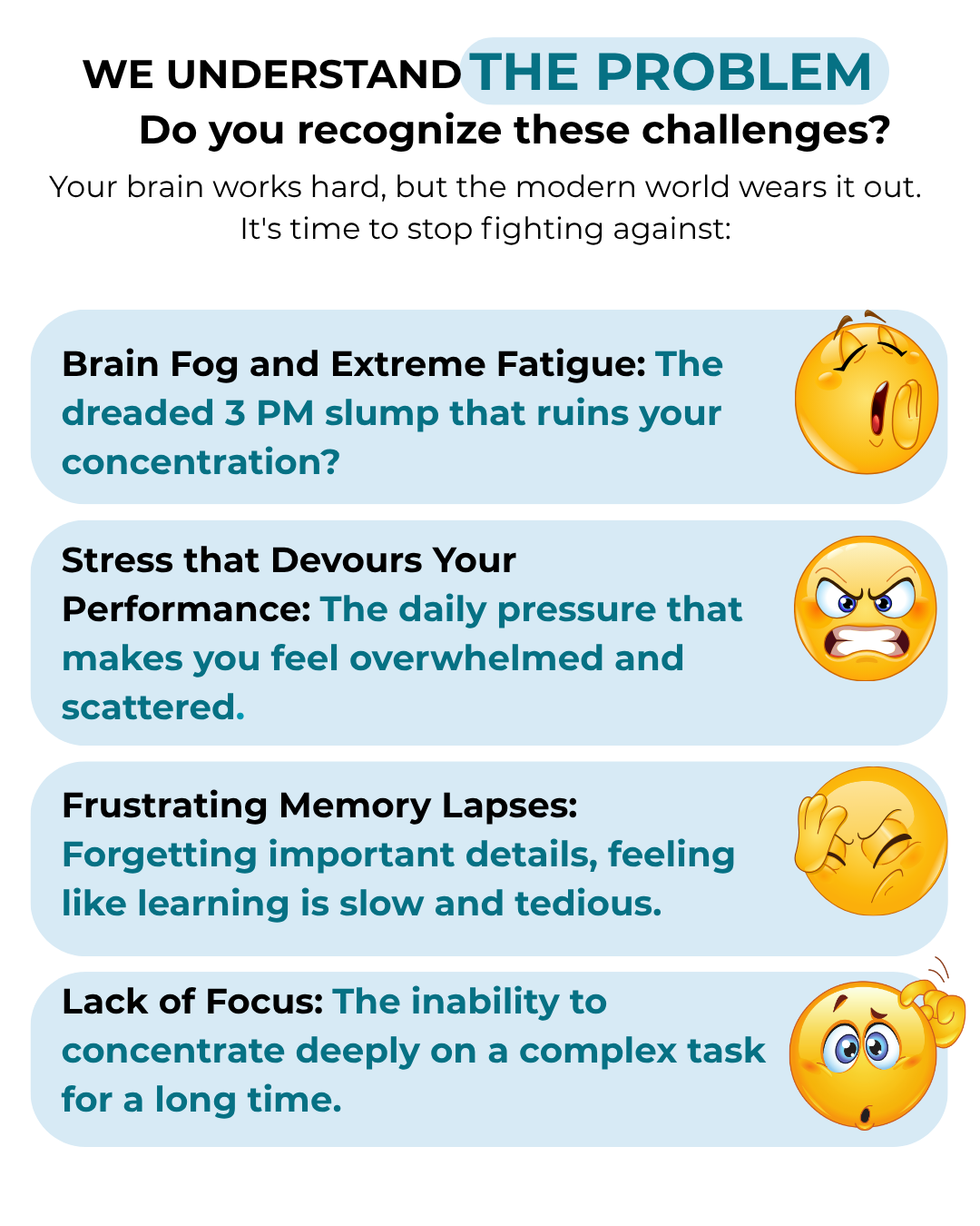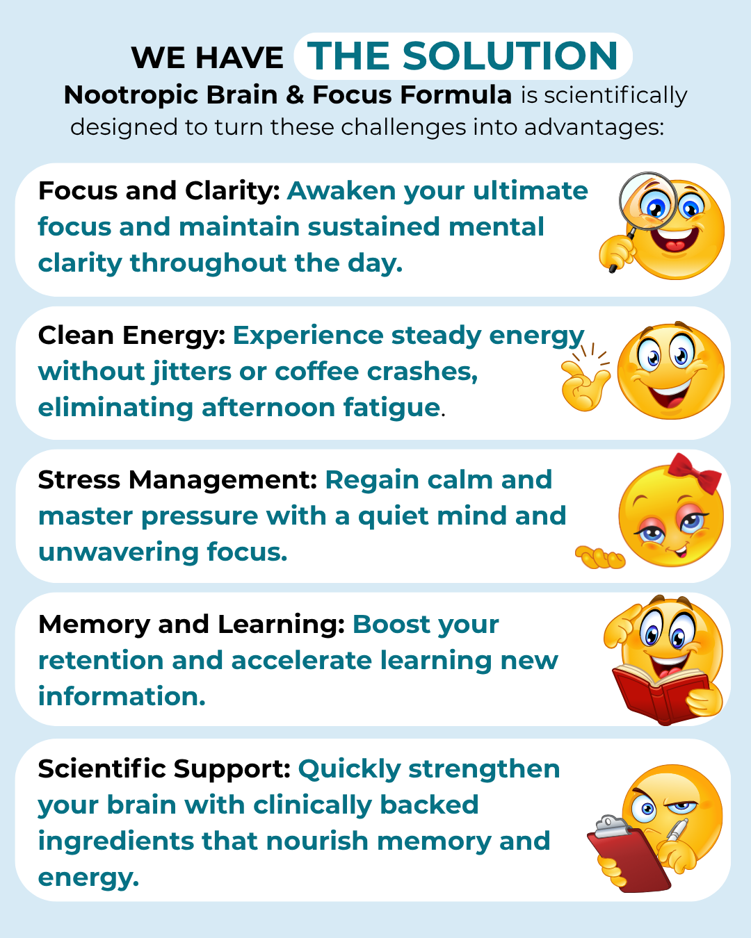 Discover a clearer mind, unwavering focus, and renewed energy. You'll feel your concentration soar, your memory improve, and your mood lift, allowing you to face each day with confidence and optimal performance. It's the boost you need to think quickly and feel 100%.